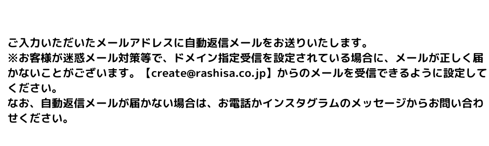 メールでのお問い合わせは下記の入力フォームに必須事項をご入力のうえ、送信してください。後ほど、メールまたはお電話で折り返しご連絡させていただきます。※個人情報の取り扱いについては、プライバシーポリシーをご覧ください。